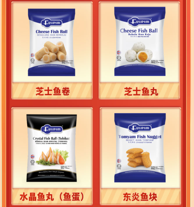 马来西亚知名品牌——Fusipim 马来西亚进口丸子:芝士鱼丸 芝士鱼卷 芝士鱼豆腐 鱼面 海鲜豆腐 东炎鱼块 泰式菜丸 水晶鱼丸(鱼蛋) 可大量批发供应 宫道: www.gzgongdao.com 马来西亚品牌【Fusipim】鱼丸 ,广东宫道国际贸易有限公司为其在中国的总代理。